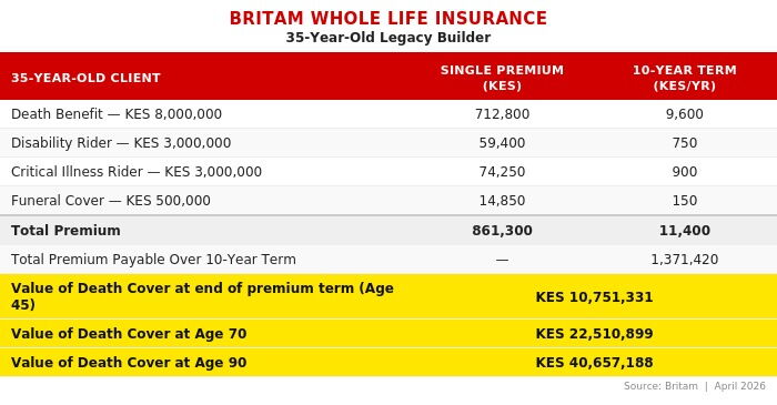 The Britam Whole Life Insurance Plan, unveiled on April 21, is designed to combine family protection, wealth accumulation, and legacy planning into a single product, targeting individuals seeking permanent life cover beyond traditional term policies.