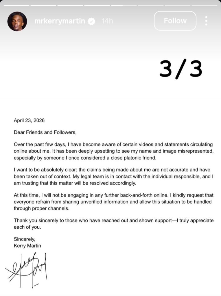 “Over the past few days, I have become aware of certain videos and statements circulating online about me. It has been deeply upsetting to see my name and image misrepresented, especially by someone I once considered a close platonic friend,” he said.