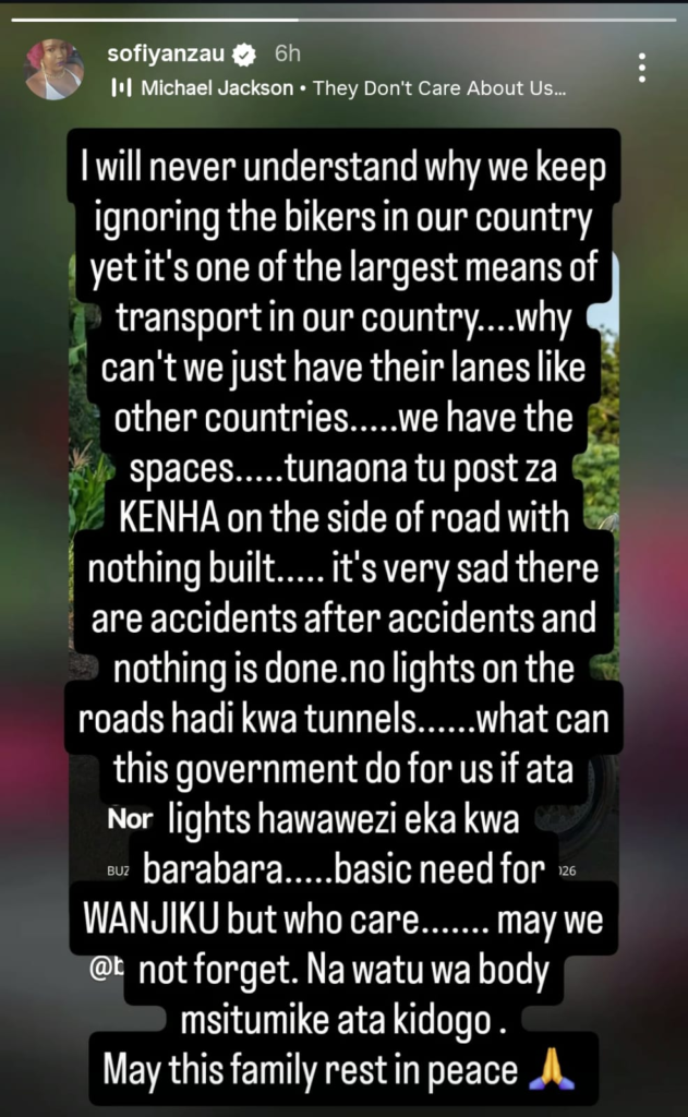 Following the news, Sofiya Nzau, a musician and public figure, expressed her grief on Instagram while highlighting broader concerns about the lack of road safety measures for bikers in the country.