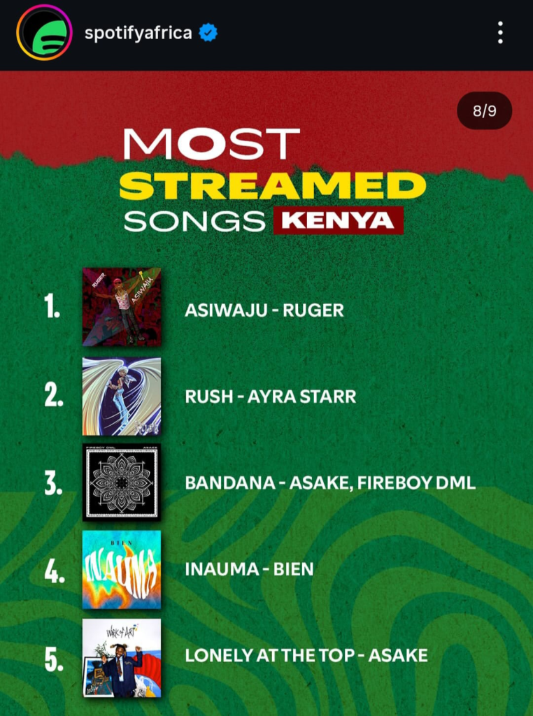 Spotify also shared the most-streamed songs in Kenya during its five-year run. The tracks showcase a mix of West African hits and local Kenyan talent.