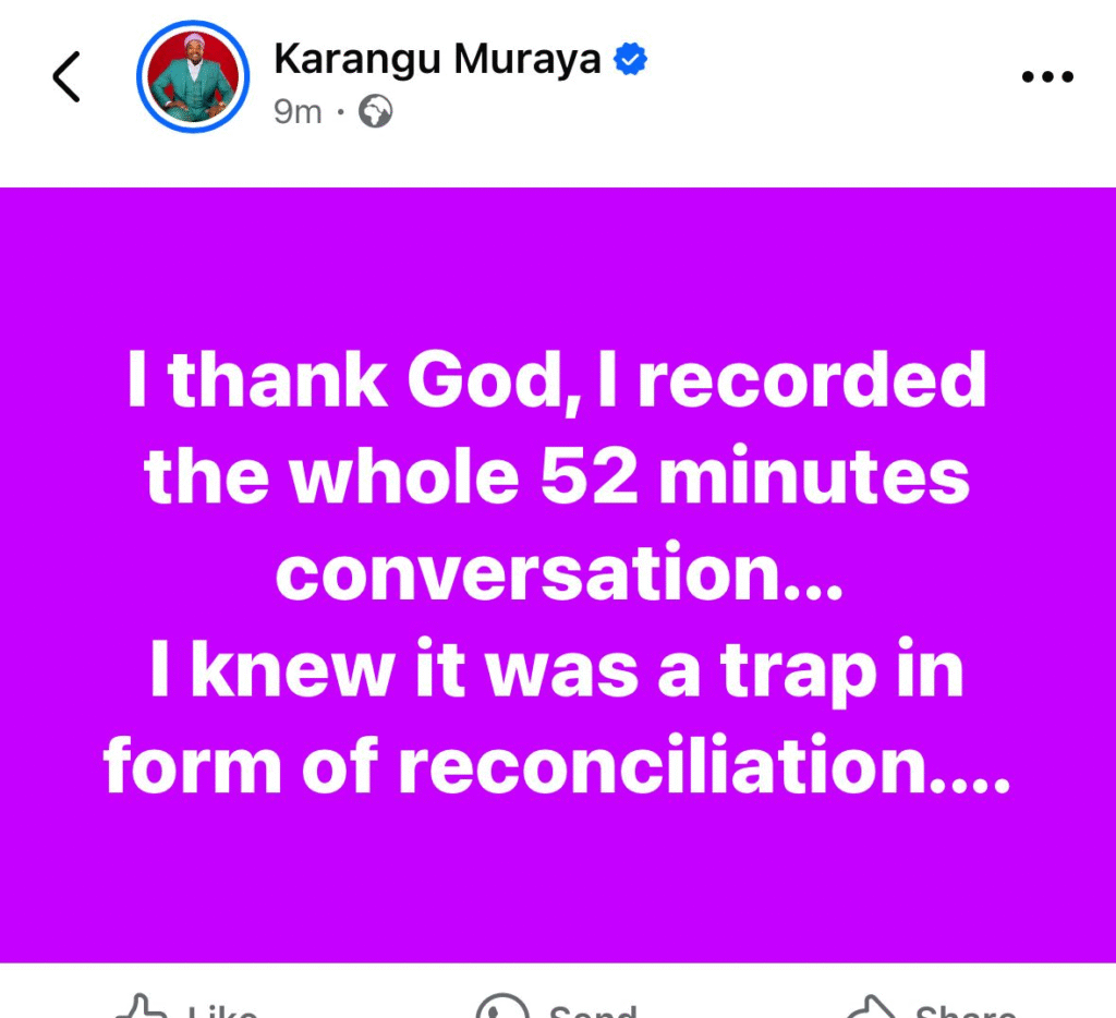 “I saw it coming. I knew it was a trap,” Karangu said, confirming he has the recordings of their private discussions.