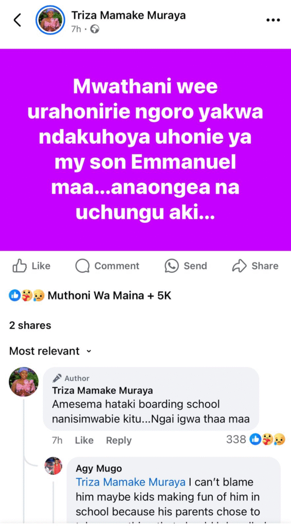 A number of them encouraged Trizah to heed her son’s wishes and consider enrolling him in a day school instead, suggesting that forcing him into boarding could deepen the emotional rift.