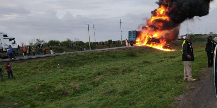 ATHI RIVER, Kenya — Two trucks burst into flames on Monday morning after a collision along the busy Nairobi–Mombasa Highway near Greenpark Estate in Athi River, Machakos County.