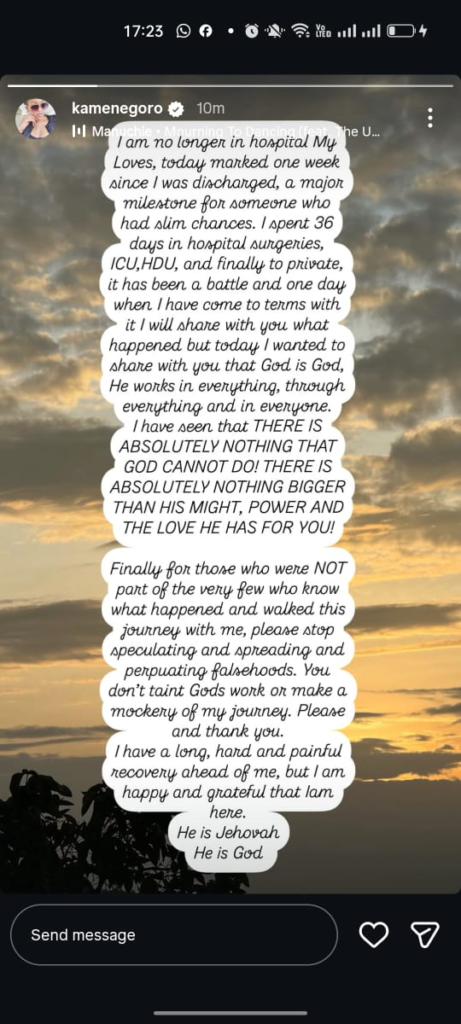 Throughout the post, Kamene repeatedly credited her survival and recovery to faith, describing the experience as a spiritual awakening.