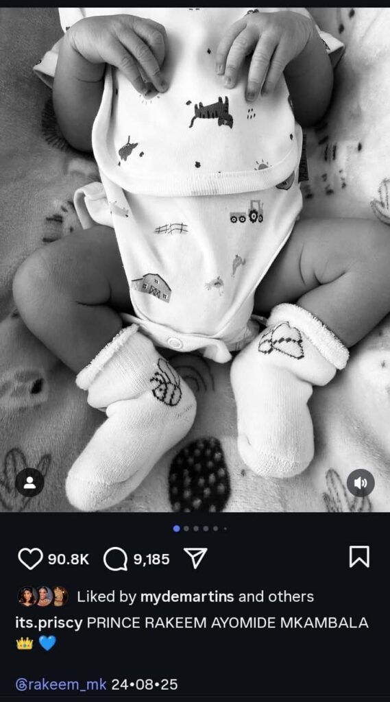 The first post on the page, a simple black-and-white photo of his tiny hands with the caption “Prince is here”, attracted thousands of likes and comments from fans and celebrities alike. Stars such as Diamond Platnumz, Tiwa Savage, and Zuchu were among the early well-wishers to leave comments.