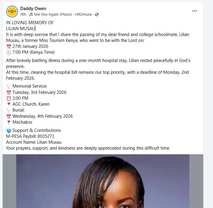 NAIROBI, Kenya — The Kenyan modeling and beauty fraternity is grieving the loss of Lilian Musau, a former Miss Tourism Kenya contestant, who passed away peacefully on Tuesday, January 27, 2026, after a brief but serious illness.