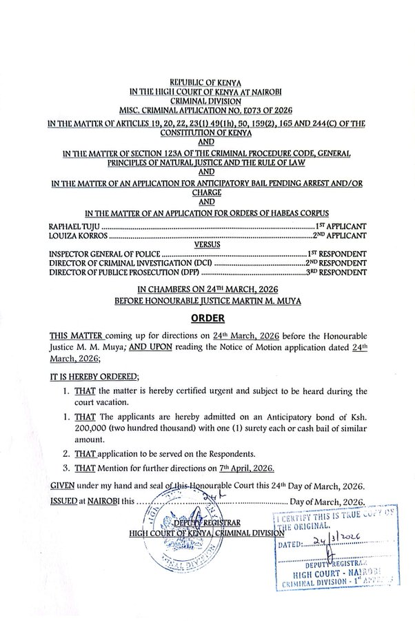 “It’s hereby ordered that the applicants are admitted on an anticipatory bond of Sh200,000 with one surety each or cash bail of a similar amount,” Justice Muya ruled, setting the matter for mention on April 7, 2026.